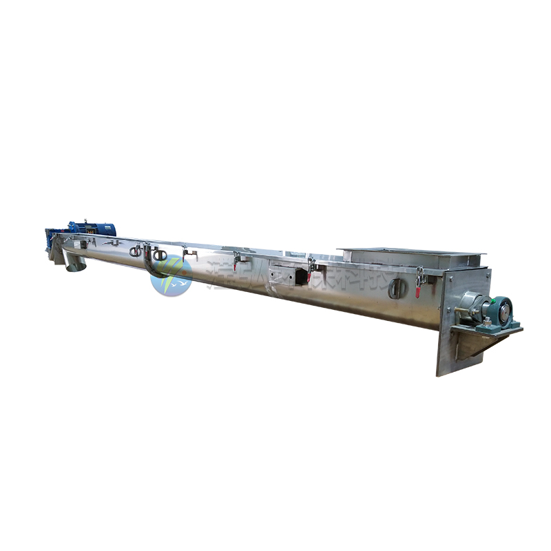 U型螺旋輸送機采用"U"形機槽、較低的螺旋裝束及固定安裝的結構,U形槽采用分段式法蘭連接,便于更換及維修內部襯套。U型螺旋輸送機適合水平或小傾角輸送,傾斜角度不超過30°,可單點進料或出料,也可多點進料或出料,對于粉塵較大以及對環境有要求的場合具有極大的優勢。另外,輸送機上部加防雨型機蓋,密封性好,輸送過程基本屬于密閉式運輸,可有效降低室內異味外泄或外部灰塵進入。